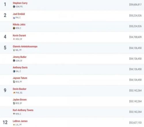 今日美媒HoopsHype发文统计了NBA球员的税后工资(指球员在扣除联邦税、州税、地方税和运动员税后的实际收入),具体如下(由高到低):