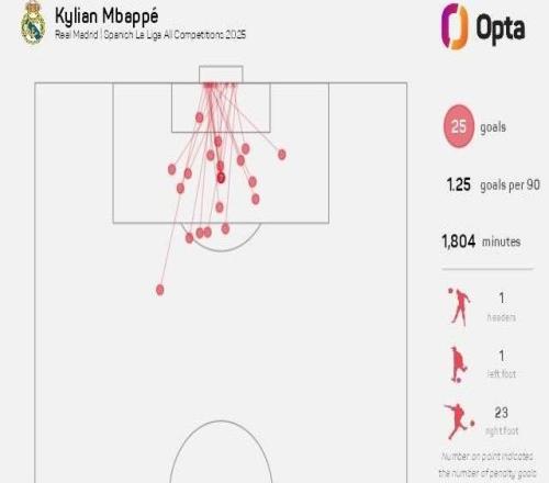 姆巴佩本赛季已打入5粒禁区外进球,为五大联赛球员最多