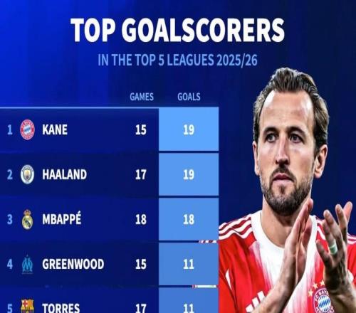 本赛季五大联赛射手榜:凯恩、哈兰德19球第1,姆巴佩18球